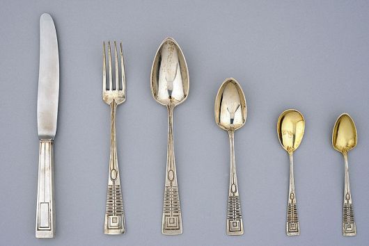 Essbesteck „Modell Wertheim“, Entwurf: Peter Behrens, Silberwarenfabrik M.J. Rückert, Mainz, 1902, Silber, Stahl, 20,8 cm (Messer), 17,8 cm (Gabel), 18,2 cm (Esslöffel), 14,5 cm (Dessertlöffel), 11,5 cm (Eislöffel), 11,3 cm (Mokkalöffel), Inv.-Nr.: rz 97/79 Bildquelle © LVR-Industriemuseum Oberhausen, Foto: Jürgen Hoffmann. |