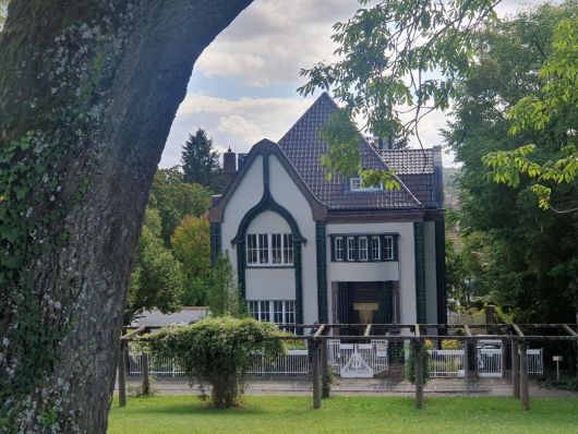 Peter Behrens Haus Behrens in Darmstadt, 1901, Wohnviertel Mathildenhöhe. Für die erste Ausstellung der Darmstädter Künstlerkolonie auf der Mathildenhöhe entwarf Behrens sein eigenes Wohnhaus und dessen Inneneinrichtung. Foto/Bildquelle © rheinische ART 2025 |