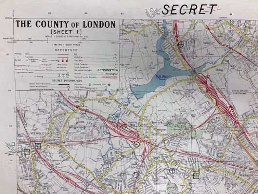 Geheime Karte von London, produziert für den Generalstreik von 1926. Sie zeigt detailliert gefährdete Militäranlagen, Polizeistationen und Feuerwachen. Bildquelle © British Library Board London 2025. Werbespruch des ausstellenden Hauses: |