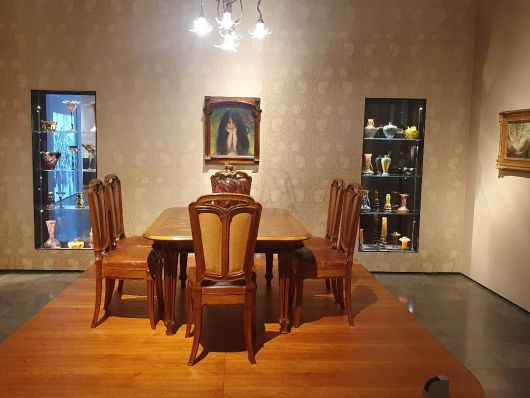 Völlig andere Sichtweisen bieten die kompletten Möbelensembles von Bernhard Pankok und Emile Gallé sowie zahlreiche Dekors wie Vasen, Skulpturen, Lampen und Keramiken. Ein Raum widmet sich der Pariser Weltausstellung von 1900, auf der bereits viele der Objekte zu sehen waren.
