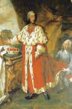 Georges Desmarées Clemens August, um 1746, Öl auf Leinwand. Der Potentat mit Zeichen seiner geistlichen und weltlichen Herrschaft: Kurmantel und Kurhut stehen für das Kurfürstentum Köln. Links im Hintergrund das kleinere Jagdschloss Falkenlust. Gemälde-Standort: Schloss Augustusburg. Bild © Wikipedia gemeinfrei