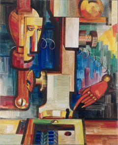 ► Hannah Höch (mehr) hinterfragte kritisch die neue Arbeitswelt. Ihr Gemälde Mensch und Maschine thematisiert das fragile Gleichgewicht zwischen technologischem Fortschritt und menschlicher Selbstbestimmung – und zeigt, wie leicht der Mensch in der modernen Arbeitswelt zum Anhängsel der Maschine zu werden droht. Der Arbeiter an der Maschine ist hier selbst zu einer Art Roboter mutiert, dessen Hand sich vom Körper gelöst hat und mit diesem nur noch durch einen Spiraldraht verbunden ist.